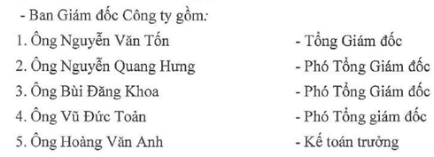 Ngoài Tổng giám đốc Tốn, Ban Tổng giám đốc của công ty gồm 03 Phó TGĐ: ông Nguyễn Quang Hưng, ông Bùi Đăng Khoa, ông Vũ Đức Toàn, và Kế toán trưởng Hoàng Văn Anh. Trong đó, TGĐ Nguyễn Văn Tốn là kỹ sư xây dựng ngành Cấp thoát nước, có 18 năm kinh nghiệm trong lĩnh vực này.
