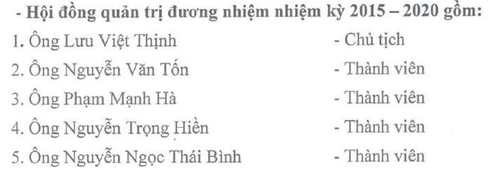 Danh sách HĐQT nhiệm kỳ 2015-2020 của công ty gồm 5 thành viên: Ông Lưu Viết Thịnh, Chủ tịch HĐQT. Các thành viên HĐQT gồm: ông Nguyễn Văn Tốn (TGĐ), ông Phạm Mạnh Hà, ông Nguyễn Trọng Hiền, và ông Nguyễn Ngọc Thái Bình.