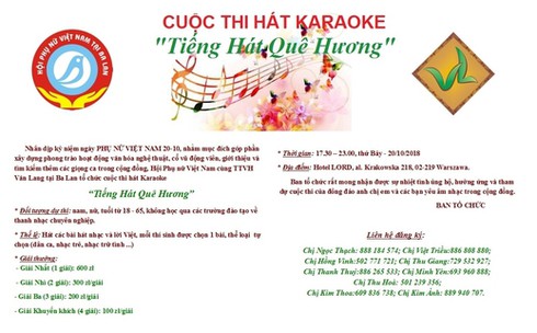 Vào thứ 7 ngày 20/10 tại Thủ đô Vac- sa- va (Ba Lan) sẽ diễn ra cuộc thi hát Karaoke “Tiếng hát quê hương” do Hội Phụ nữ Việt Nam tại Ba Lan phối hợp với Trung tâm Văn hóa Văn Lang tổ chức.
