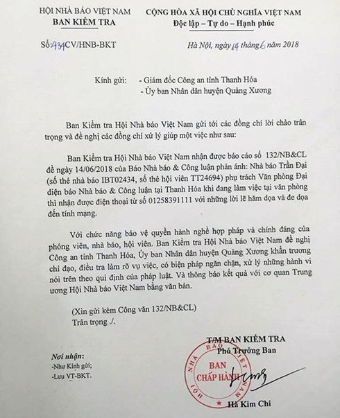 Liên quan đến vụ việc Nhà báo (NB) Trần Đại bị dọa giết, Ban kiểm tra của Hội Nhà báo Việt Nam đã có công văn số 434/CV/HNB-BKT gửi Giám đốc Công an tỉnh Thanh Hóa và UBND huyện Quảng Xương đề nghị làm rõ vụ việc.