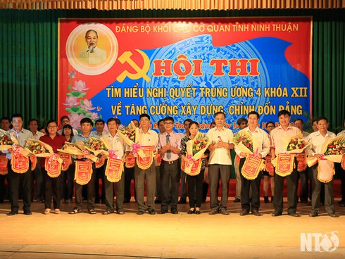 Tặng cờ lưu niệm và hoa các chi bộ đảng tại vòng chung kết hội thi (theo báo Ninh Thuận) |