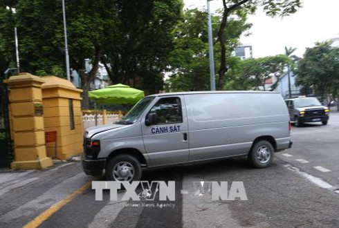 Xe cảnh sát dẫn giải các bị cáo đến tòa xét xử lúc 6h40 phút. (Ảnh: Doãn Tấn - TTXVN) |
