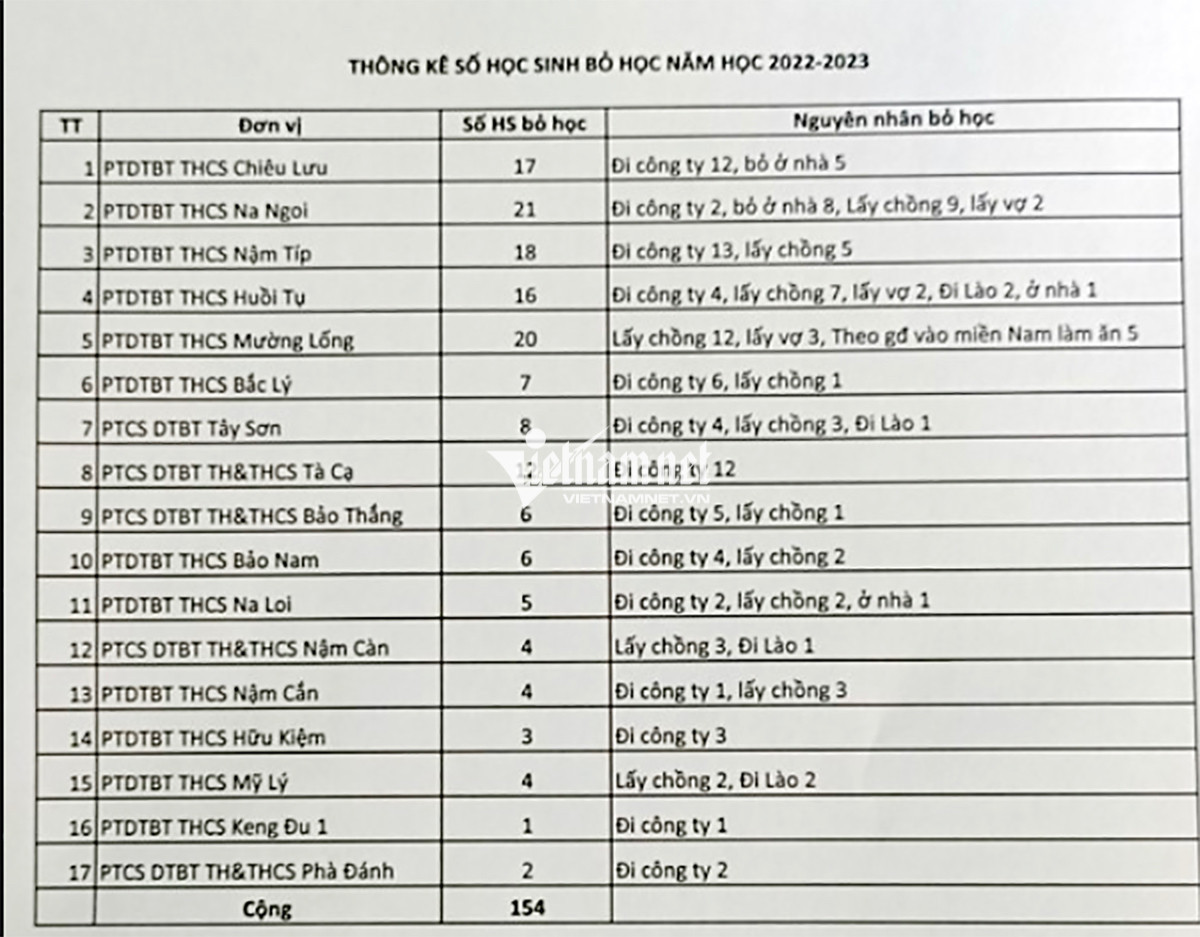 Theo như danh sách thông kê, năm học 2022-2023, có 154 em học sinh tại các trường THCS trên địa bàn nghỉ học. Phần lớn các em bỏ học đi làm công ty và lấy chồng.
