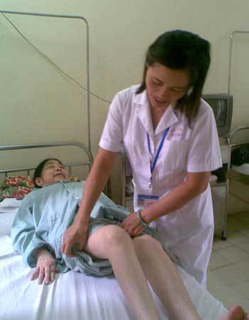 Theo y tá này, ông bà Oanh - Khúa là bệnh nhân "ruột" của khoa mình. Hơn 15 năm bà Khúa bị viêm khớp dạng thấp, với bàn tay bàn chân đã biến dạng khó vận động, cột sống đã xẹp lún nên không tự đi được, phải ngồi xe lăn. Hầu như mọi sinh hoạt cá nhân từ việc nhỏ nhất như ăn uống, vệ sinh bà đều cần giúp đỡ.