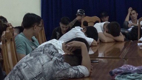 Hình ảnh các thanh niên bị đưa về trụ sở công an để kiểm tra ma túy. |