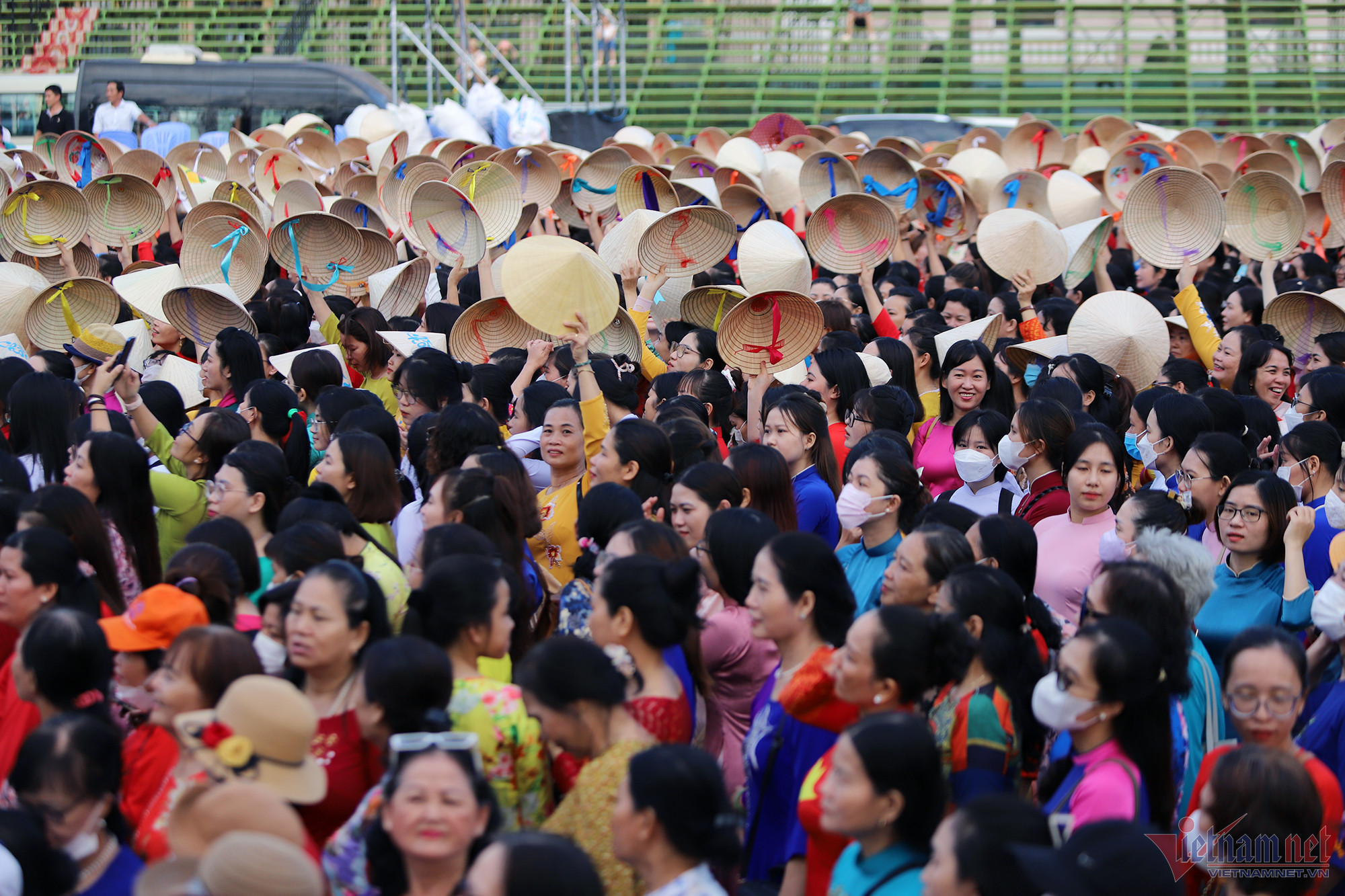 “Mặc trên mình chiếc áo dài để tham dự chương trình này em rất vui và tự hào”, Lê Thị Ngọc Hảo (tay vẫy nón) chia sẻ và cho biết hàng trăm người là đồng nghiệp làm chung công ty với cô cũng tham gia hoạt động này.