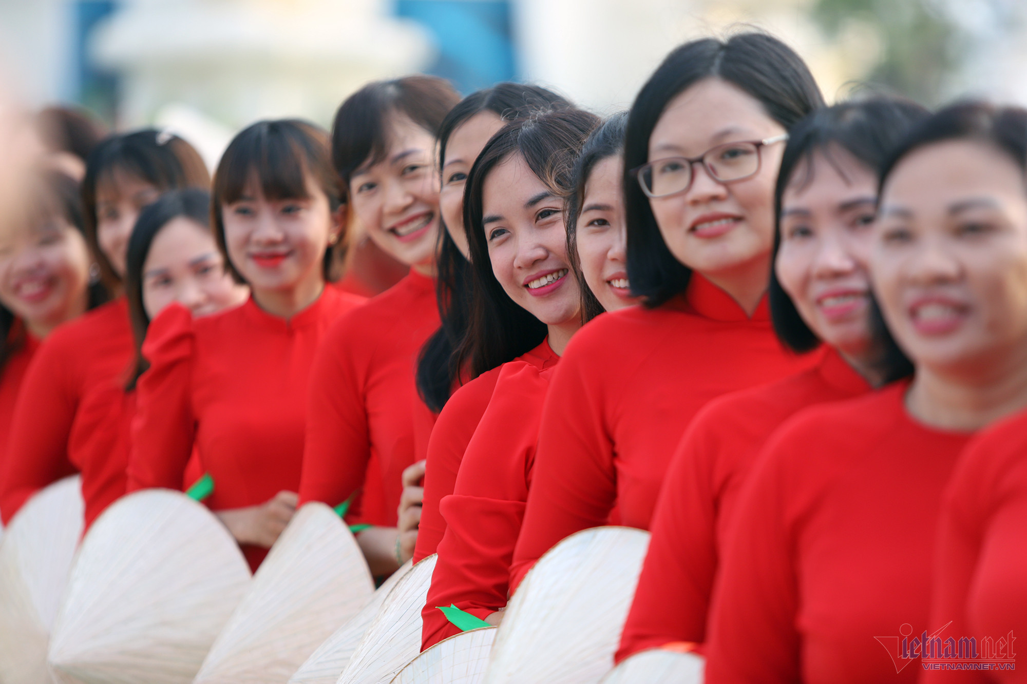 Có mặt tại Quảng trường khá sớm, những người tham gia diễu hành rạng rỡ trong tà áo dài. Nhiều người chọn áo dài có màu đỏ, đội nón lá để tôn lên vẻ đẹp của người phụ nữ Việt Nam.
