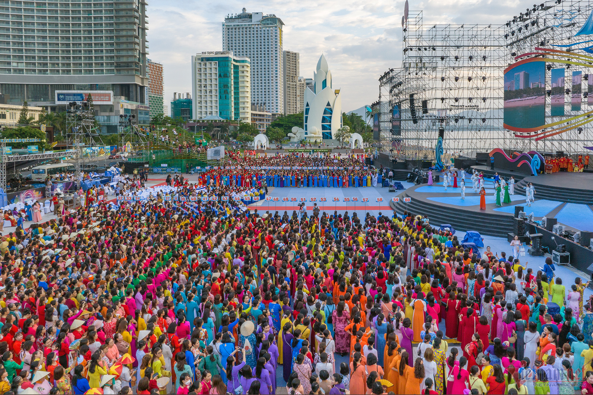 Sáng 4/6, hơn 6.000 người trong trang phục áo dài truyền thống và cách tân tập trung tại Quảng trường, TP Nha Trang để cùng diễu hành “Tôn vinh áo dài – di sản văn hóa Việt Nam”. Sự kiện do Liên hiệp Phụ nữ tỉnh Khánh Hòa tổ chức, nằm trong các hoạt động của Festival biển Nha Trang 2023. Ảnh: Vương Mạnh Cường - Xuân Ngọc.