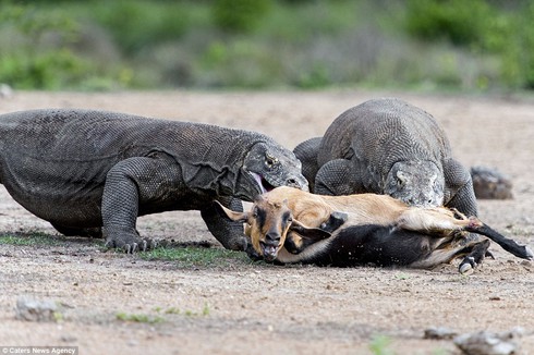Một con rồng cắn trúng chân của dê, vật con mồi xuống đất và dùng hàm răng khỏe sắc nhọn cắn vào cổ con mồi.
