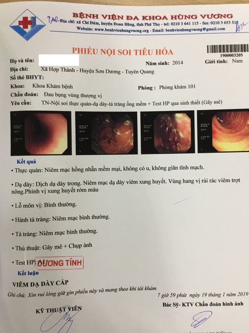Cũng tương tự như trường hợp của bệnh nhi B, bệnh nhi N.X.H, 12 tuổi cũng phải nhập viện điều trị do viêm loét hành tá tràng và xét nghiệm vi khuẩn HP dương tính.