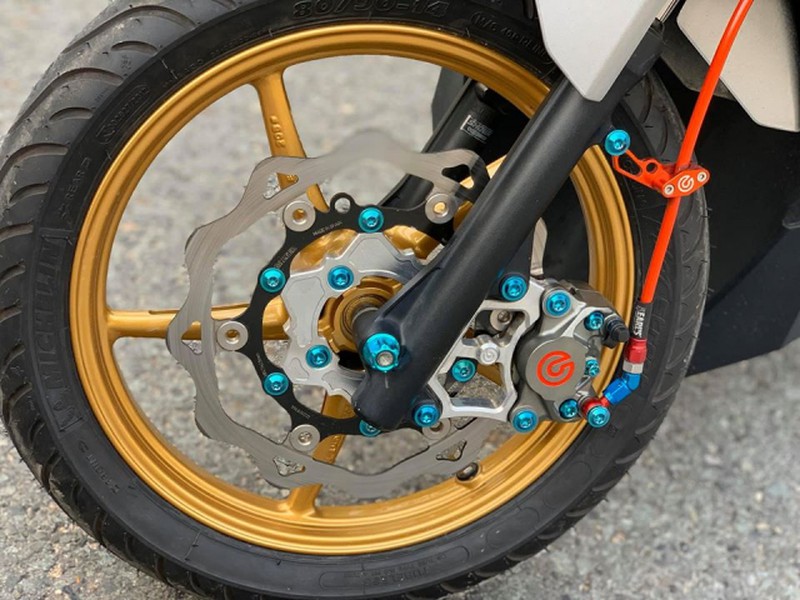 Phần đầu xe được khoét rộng hơn tí xíu để người thợ dễ dàng lắp ráp cùm tay thắng Brembo RCS 19 thế hệ tiếp theo có tên là Corsa Corta với ngoại hình to lớn giúp đầu xe nổi bật hơn một cách hoàn hảo, chủ xe chỉ sử dụng một đoạn ống trong suốt đi kèm bình dầu được cố định qua một đoạn Titan để làm ổ chứa dầu. |