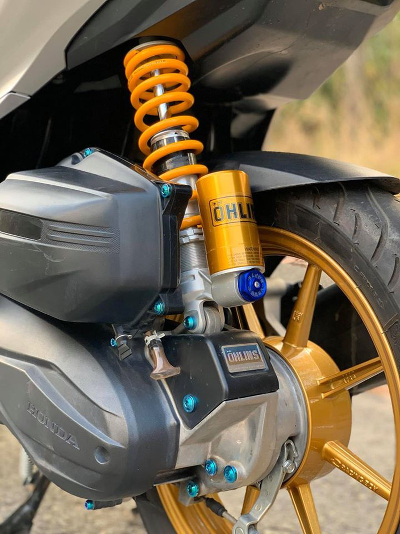 Sử dụng phuộc Ohlins bình dầu rời nằm dưới tích hợp núm CNC màu xanh, đây là phiên bản mới nhất được sản xuất dành cho Vario/Click có tổng chiều cao 330mm, với ngoại hình màu vàng đặc trưng càng làm cho chiếc xe độ thêm phần sang trọng và danh giá. |
