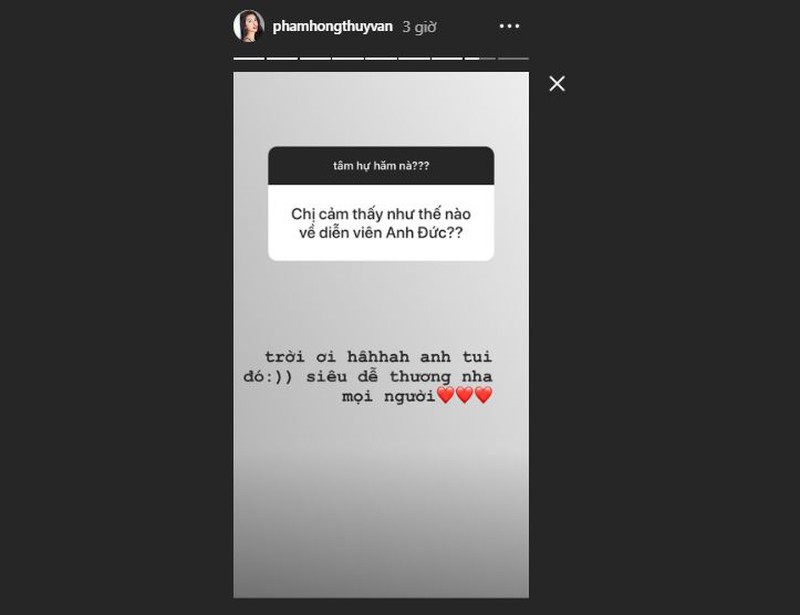 Khán giả hào hứng hỏi: “Chị cảm thấy như thế nào về diễn viên Anh Đức?”, Á hậu Thúy Vân than trời: “Trời ơi!Anh tôi đó, siêu dễ thương nha mọi người”. |