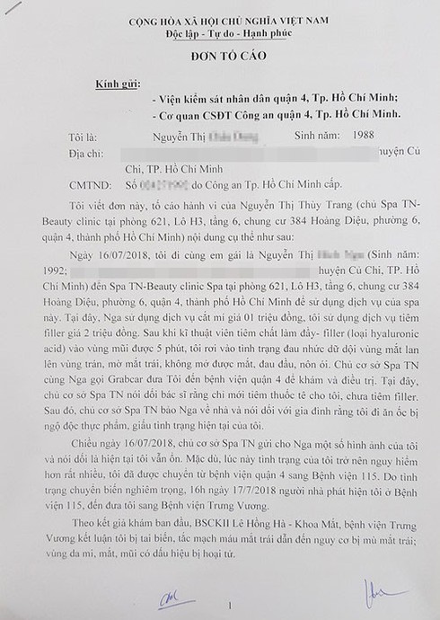 Cụ thể, theo đơn của chị N.T.C.D (30 tuổi) và em gái là N.T.B.N (26 tuổi, cùng ngụ H.Củ Chi, TP.HCM), khi thấy quảng cáo trên mạng xã hội, ngày 16.7 chị cùng em gái tìm đến spa TN - Beauty clinic Spa (phòng 621, lô H3, tầng 6, chung cư 384 Hoàng Diệu, P.6, Q.4) do Nguyễn Thị Thùy Trang làm chủ để sử dụng dịch vụ của spa này.