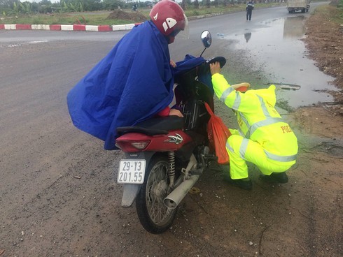 Chị Hà đứng đây vẫy nhiều xe đi đường nhưng không có ai đỗ lại giúp đỡ mẹ con chị, trời về chiều ngày một lạnh thêm làm hai con chị rét qua đứng co ro, run cầm cập. Sau khi biết chuyện, tổ công tác đã đưa cháu Ngọc Anh và Bảo Trâm lên xe cảnh sát ngồi cho ấm, đồng thời giúp sửa xe máy cho chị Hà, song cố gắng mãi mà xe không nổ máy được. Sau đó xe cảnh sát đưa 2 cháu về nhà tại Khu đô thị Thanh Hà ở quận Hà Đông, còn chị Hà cùng xe máy được Trung úy Vũ và Trung úy Sơn hỗ trợ đưa đi sửa…” - Trung tá Quang kể lại.