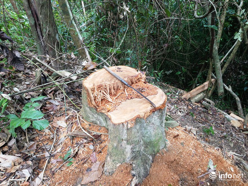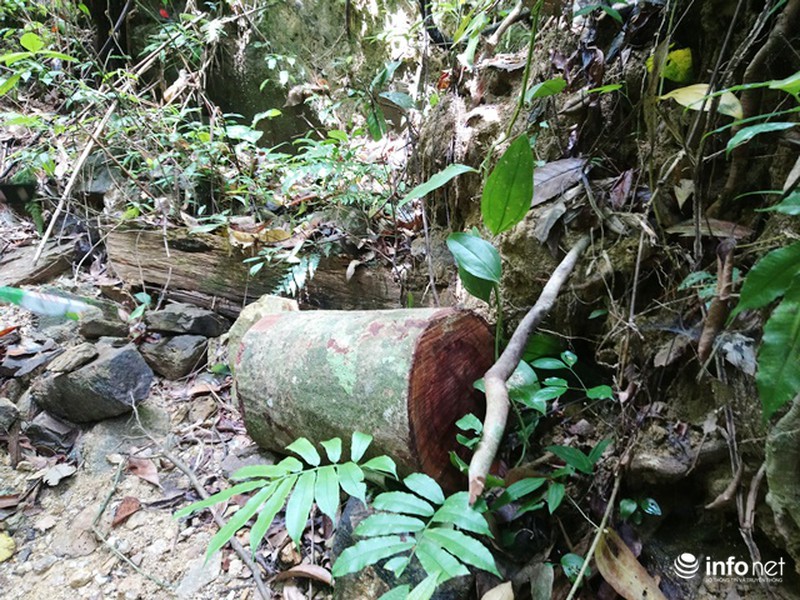 Nghi ngờ khu rừng nơi đây đang bị tàn phá, PV quyết định leo lên đỉnh núi tìm hiểu. Đúng như dự đoán, khi PV leo lên phần đỉnh núi thì bắt gặp 4 cây gỗ đã bị đốn hạ, chỉ còn lại phần gốc. Điểm đặc biệt, tại mỗi gốc bị cưa hạ đều có đánh dấu phấn trắng bằng dòng chữ ký hiệu “TT5/18, 14/09/18”.