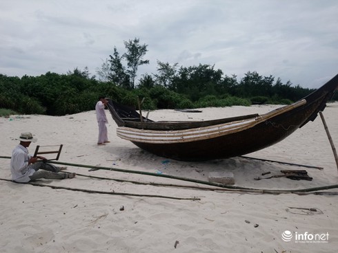 PV chúng tôi chào các ngư dân đang hành nghề kéo ruốc và tiếp tục đi dọc theo bờ biển khoảng 500m thì bắt gặp 2 ngư dân đang say sưa sửa chữa, đóng ghe trên bãi cát rộng sát bờ biển để chuẩn bị cho vụ mùa mới. Tại đây, ông Hồ Văn Dũng (45 tuổ, trú thôn Hải Thành, xã Phong Hải,huyện Phong Điền, tỉnh Thừa Thiên – Huế) chia sẻ, “Ngư dân ở đây đánh bắt gần bờ nên ít tàu lớn và chỉ sử dụng ghe, để đóng được một chiếc ghe thì mất cả năm trời tính từ khi có vật liệu rồi hoàn thành vì phải ngâm vật liệu rất lâu mới đảm bảo độ bền”.