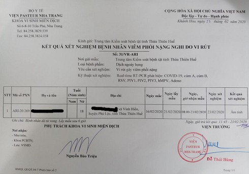 Kết quả xét nghiệm âm tính với Covid-19 từ Viện Pasteur Nha Trang. |