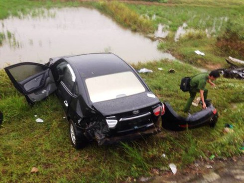 Tại hiện trường, chiếc ô tô lao xuống ruộng, 2 xe máy bị hư hỏng hoàn toàn.