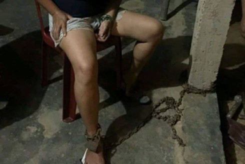 Hình ảnh bà Nguyễn Thị G. bị trói xích ngồi trên ghế. |