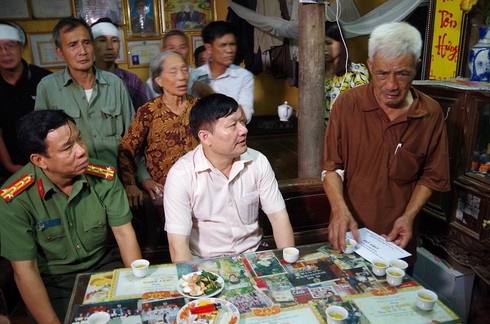 Ông Nguyễn Văn Phóng - Chủ tịch UBND tỉnh Hưng Yên (người đeo đồng hồ) và Đại tá Đỗ Đình Hào - Giám đốc Công an tỉnh đến nhà nạn nhân trong vụ án giết người tại phường Hồng Châu, TP Hưng Yên. |