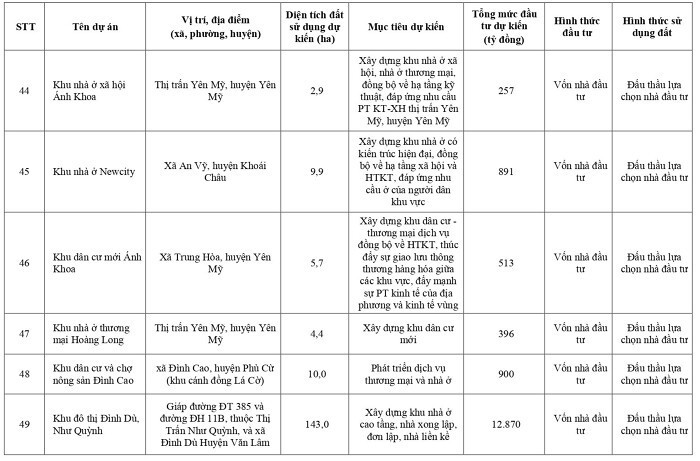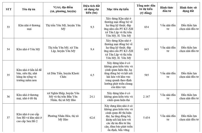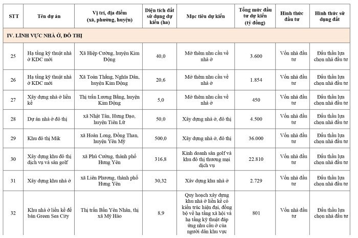 Khu đô thị Mik trên địa bàn xã Hoàn Long, Đồng Than, huyện Yên Mỹ; diện tích dự kiến 500 ha, tổng mức đầu tư khoảng 36.000 tỷ đồng; dự án xây dựng khu đô thị dịch vụ và sân golf ở xã Phú Cường, TP Hưng Yên, diện tích 316 ha, 22.810 tỷ đồng.