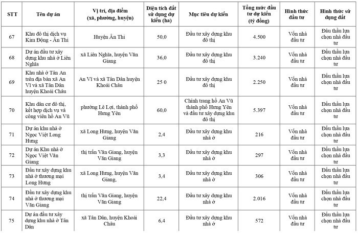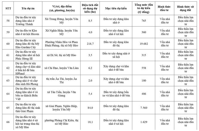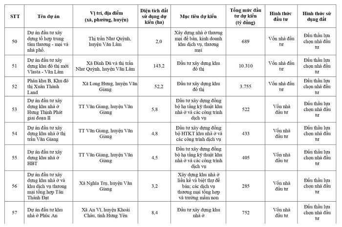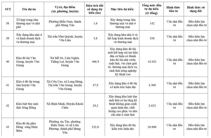 Dự án khu đô thị Văn Giang tại các xã Mễ Sở, Liên Nghĩa, Thắng Lợi, huyện Văn Giang, diện tích 466 ha, 42.021 tỷ đồng; khu đô thị phía Đông sông Điện Biên nằm trên địa bàn các phường An Tảo, phường Hiến Nam và xã Liên Phương, TP Hưng Yên, diện tích 232 ha, 20.880 tỷ đồng.