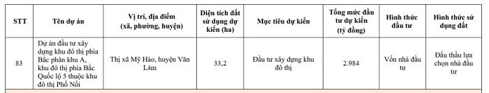 Dự án đầu tư xây dựng khu đô thị Mỹ Hào Garden City ở phường Nhân Hòa và Phan Đình Phùng, thị xã Mỹ Hào, diện tích dự kiến hơn 218 ha, tổng mức đầu tư dự kiến 19.682 tỷ đồng….