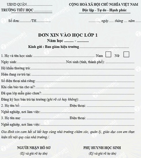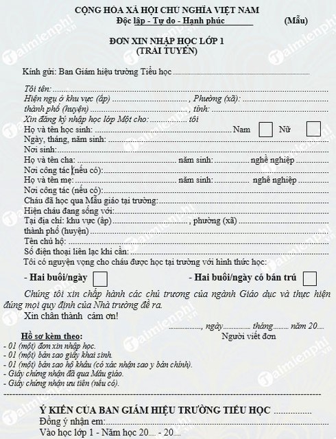 Mẫu đơn xin vào lớp 1 dành cho học sinh học trái tuyến: