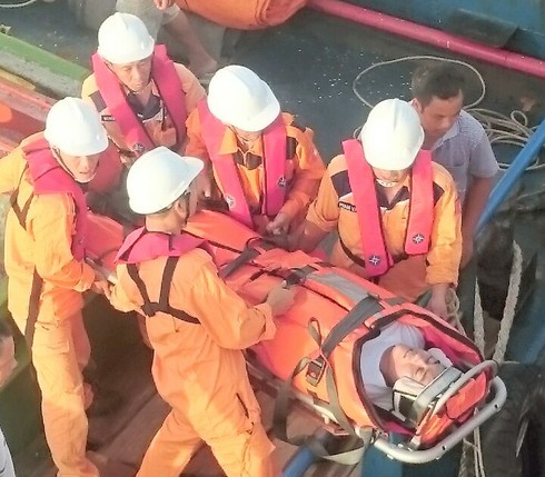 Thuyền viên Tình được đưa lên tàu cứu hộ. (Ảnh: Vietnam MRCC cung cấp) |