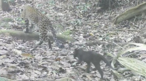 Báo đen và báo đốm cùng chơi đùa trong rừng Thái Lan. |