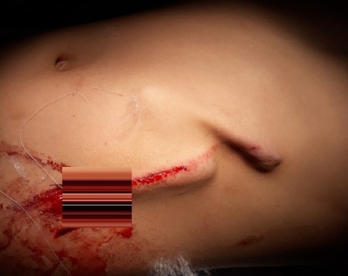 Dị vật xuyên thủng vùng da hạ sườn phải bệnh nhân Sang(Ảnh: TK). |
