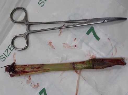 Sau khi phẫu thuật, các bác sỹ đã lấy ra một gốc cây cỏ voi có kích thước 20cm x 2cm, nằm dưới da bụng. Ngay sau đó, bệnh nhân được tiến hành rửa sạch vết thương, khâu phục hồi và đặt dẫn lưu.