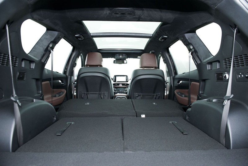 So với bản cũ, hàng ghế cuối trên SantaFe rộng hơn, phù hợp với chiều cao trung bình 1m68 - 1m7. Khi cần, khách hàng có thể gập phẳng xuống sàn để mở rộng khoang hành lý.