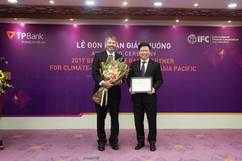 Chiều 21/5, tại Ngân hàng TMCP Tiên Phong (TPBank), ông Kyle Kelholfer, Giám đốc quốc gia phụ trách Việt Nam, Cam-pu-chia và Lào, đại diện tổ chức Tài chính Quốc tế IFC đã trao giải thưởng “Ngân hàng phát hành tốt nhất 2017 về lĩnh vực Tài trợ Thương mại cho các dự án thích ứng biến đổi khí hậu thông minh Khu vực Đông Á – Thái Bình Dương” cho TPBank.