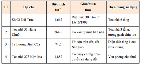 Hiện công ty đang kinh doanh và cho thuê văn phòng tại 2 tòa nhà văn phòng gồm: Tòa nhà 7 tầng Toserco Building số 273 Kim Mã, Hà Nội tổng diện tích 1.852m2 trong đó diện tích sàn xây dựng 9.322m2; và toàn nhà số 01 Núi Trúc, Hà Nội với tổng diện tích đất 1.667m2, diện tích sàn xây dựng 3.044m2...