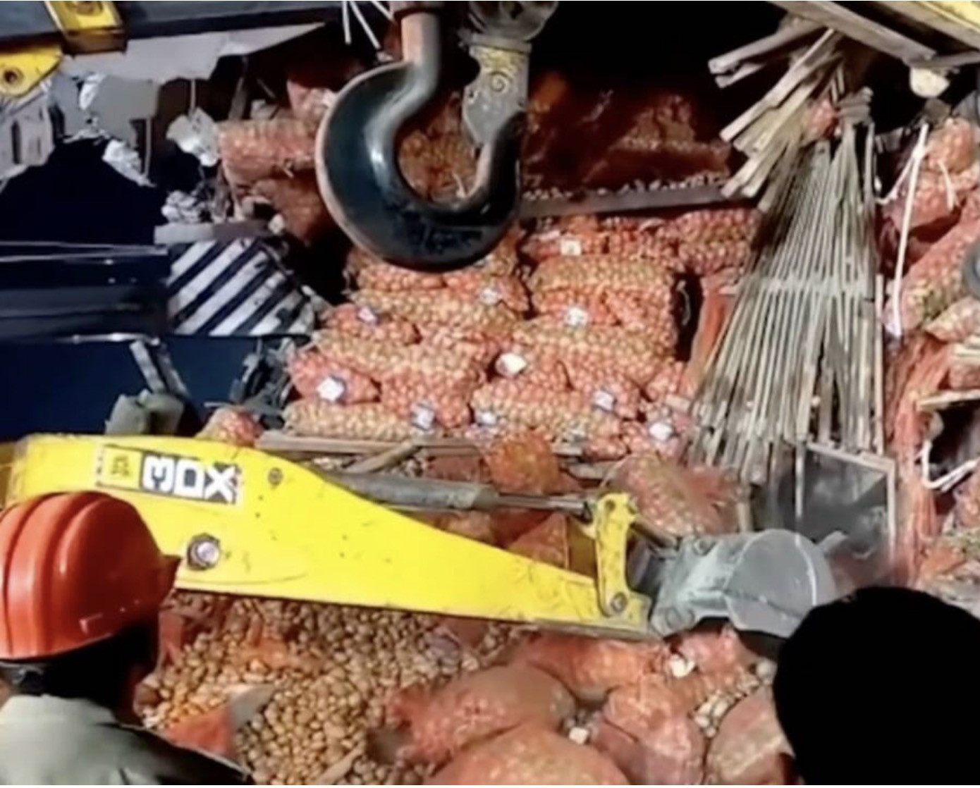 Cảnh sát Ấn Độ cho biết, trần của nhà kho được xây trái phép cách đây ba tháng và nó đã bị sập dưới sức nặng của hàng trăm bao tải khoai tây.
