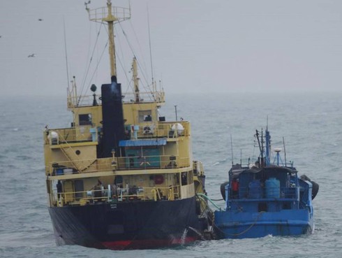 Tàu chở dầuYu Jong 2 (bên trái) treo cờ Triều Tiên và tàu Min Ning De You 078 tiến hành tiếp dầu ngay trên biển Hoa Đông hôm 16/2. |
