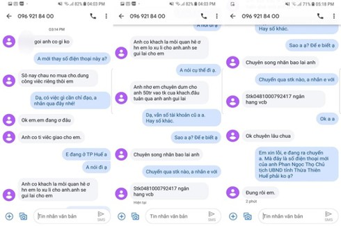 Theo đó, sau khi phóng viên dùng số điện thoại cá nhân gọi điện vào số điện thoại mạo danh Chủ tịch UBND tỉnh Thừa Thiên - Huế Phan Ngọc Thọ là “0969.218.400” thì người sử dụng số máy này không bắt máy. Tuy nhiên sau đó, phóng viên bất ngờ nhận được tin nhắn của kẻ mạo danh ông Phan Ngọc Thọ - Chủ tịch UBND tỉnh Thừa Thiên - Huế và nhờ phóng viên chuyển giúp 50 triệu đồng cho khách ở Hà Nội. Đối tượng cũng không ngần ngại cung cấp thông tin tài khoản ngân hàng của người nhận được cho là ở Hà Nội.