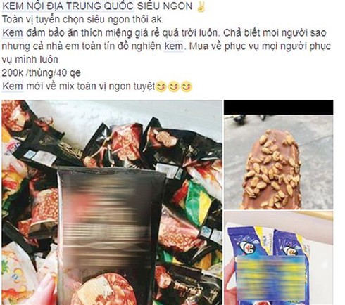 Khoảng hơn 1 tháng nay, trên các diễn đàn mạng xã hội nhiều chị em đang xôn xao với loại kem được quảng cáo là hàng "nội địa Trung Quốc" với cả chục loại hương vị khác nhau. Loại kem này được rao bán với giá từ 120.000 đồng đến 180.000 đồng/thùng (khoảng 3.000 đồng/que).