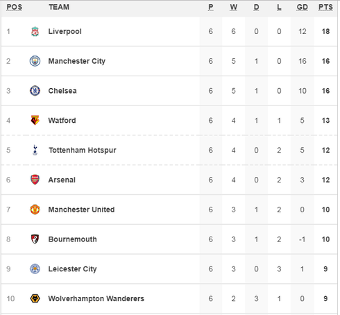 - Bảng xếp hạng Premier League sau 6 vòng đấu: