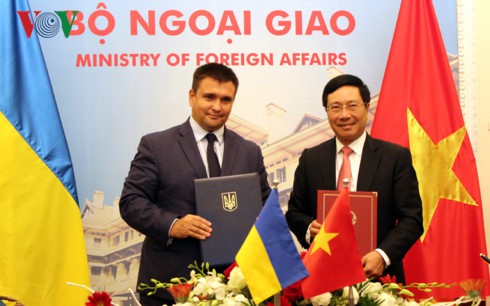 Phó Thủ tướng, Bộ trưởng Ngoại giao Phạm Bình Minh và Bộ trưởng Ngoại giao Ukraine Pavlo Klimkin ký Kế hoạch tham vấn giữa hai Bộ Ngoại giao giai đoạn 2018 – 2019. Ảnh: VOV |