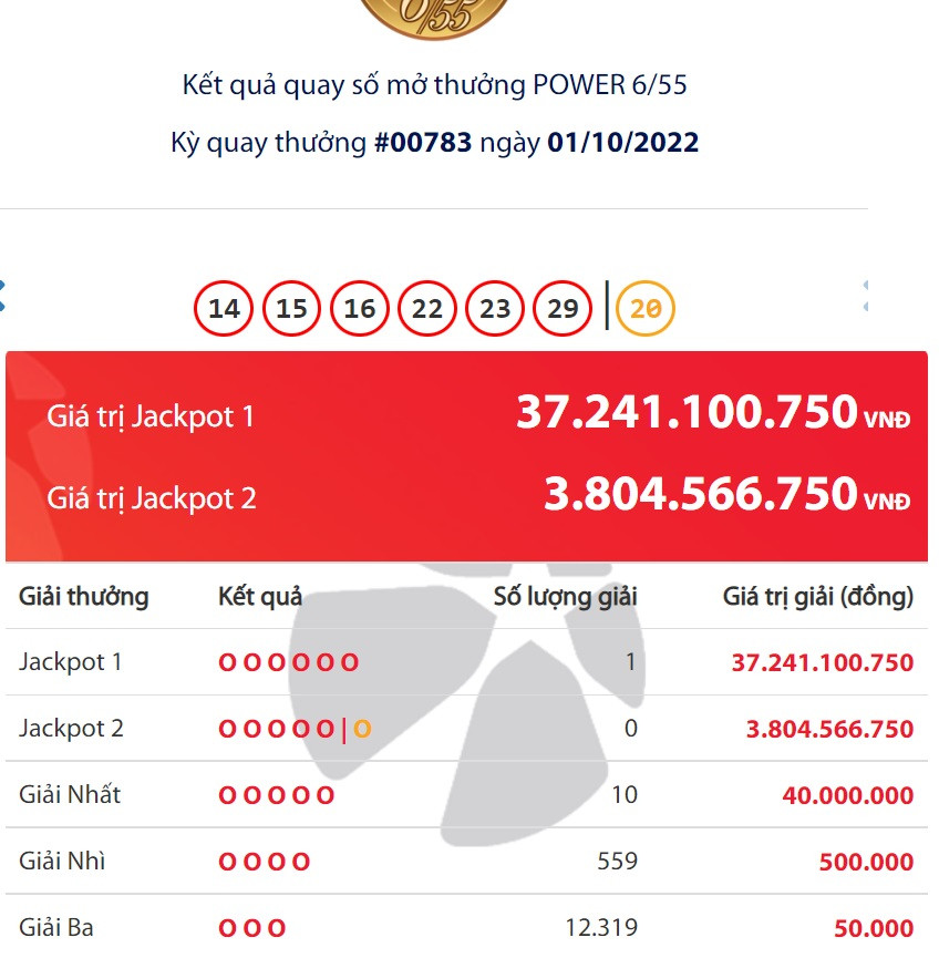 Kết quả xổ số Vietlott tối 1/10 cho thấy, tại kỳ quay số mở thưởng thứ 783 loại hình xổ số Power 6/55, Công ty Xổ số điện toán Việt Nam (Vietlott) đã tìm được một chiếc vé trúng Jackpot 1 trị giá 37.241.100.750 đồng.
