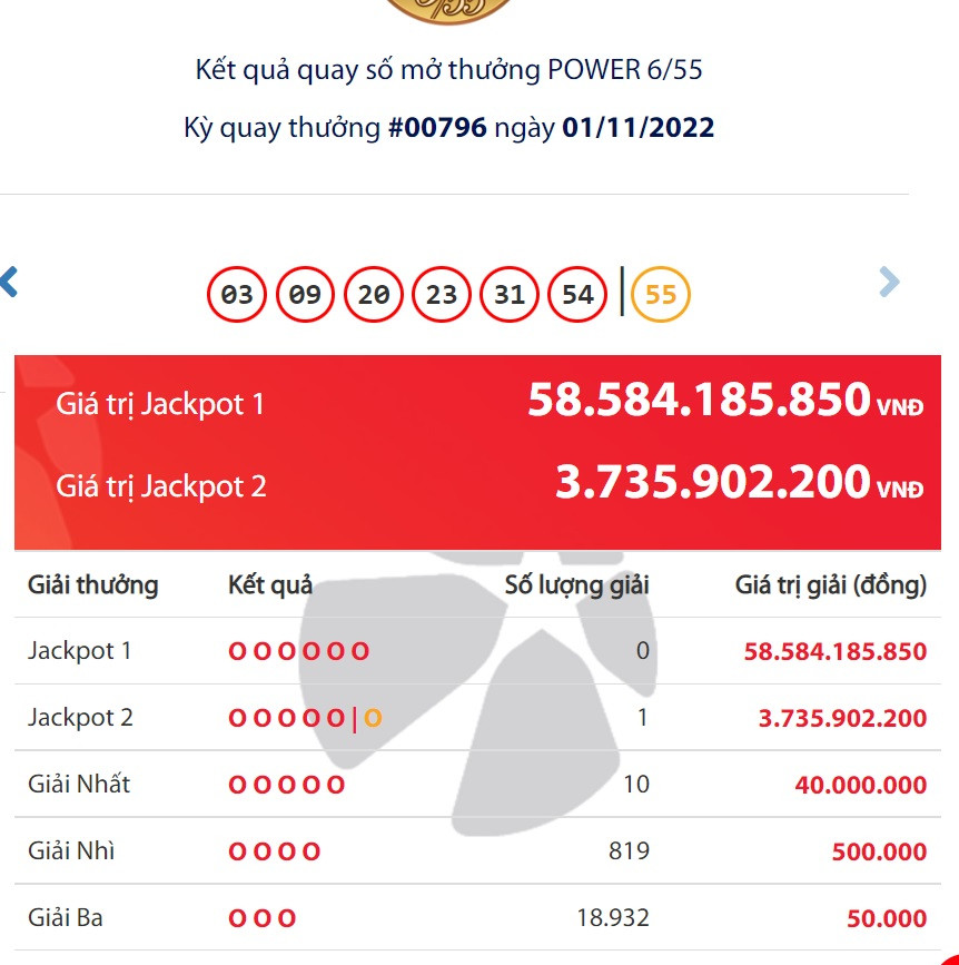 Kết quả xổ số Vietlott tối 1/11 cho thấy, tại kỳ quay số mở thưởng thứ 796 loại hình xổ số Power 6/55, Công ty Xổ số điện toán Việt Nam (Vietlott) đã tìm được một chiếc vé trúng Jackpot 2 trị giá 3.735.902.200 đồng.