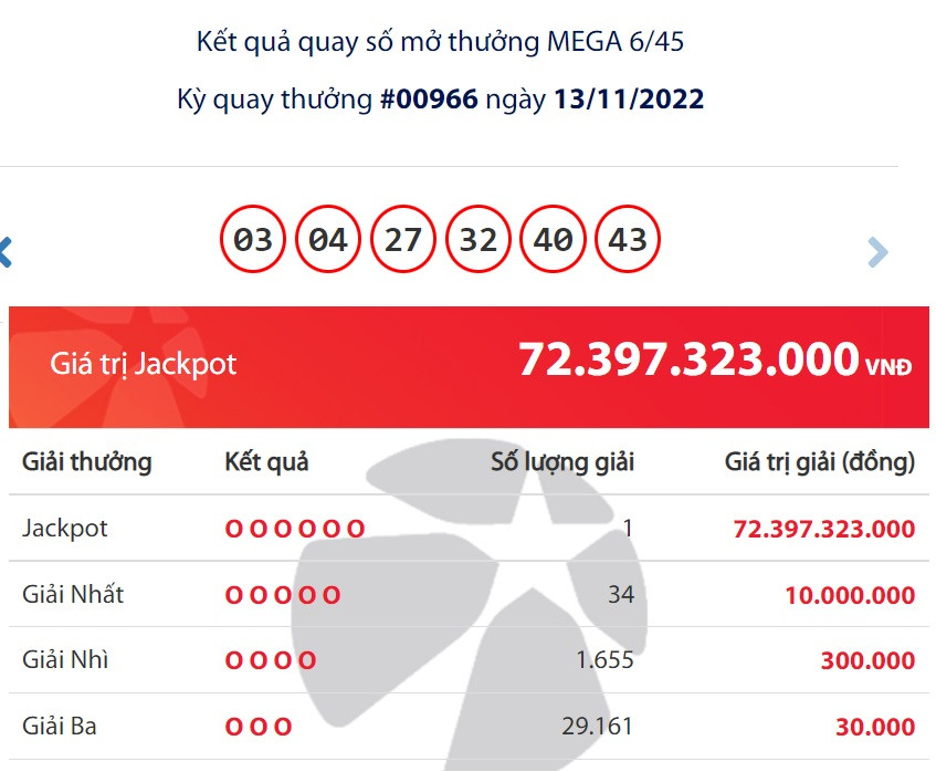 Kết quả xổ số Vietlott tối 13/11 cho thấy, tại kỳ quay số mở thưởng thứ 966 loại hình xổ số Mega 6/45, Công ty Xổ số điện toán Việt Nam (Vietlott) đã tìm được duy nhất một chiếc vé trúng Jackpot trị giá 72.397.323.000 đồng.