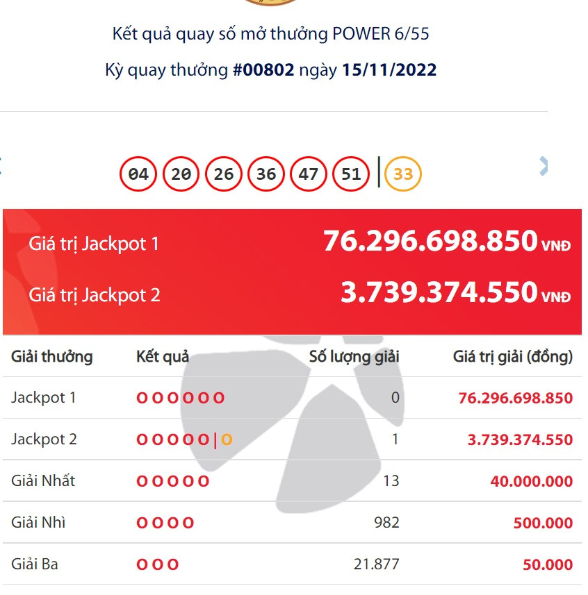 Kết quả xổ số Vietlott tối 15/11 cho thấy, tại kỳ quay số mở thưởng thứ 802 loại hình xổ số Power 6/55, Công ty Xổ số điện toán Việt Nam (Vietlott) đã tìm được một chiếc vé trúng Jackpot 2 trị giá 3.739.374.550 đồng.