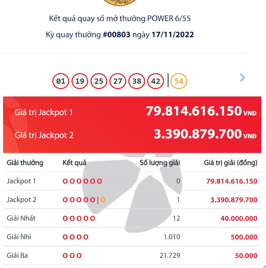 Kết quả xổ số Vietlott tối 17/11 cho thấy, tại kỳ quay số mở thưởng thứ 803 loại hình xổ số Power 6/55, Công ty Xổ số điện toán Việt Nam (Vietlott) đã tìm được một chiếc vé trúng Jackpot 2 trị giá 3.390.879.700 đồng.