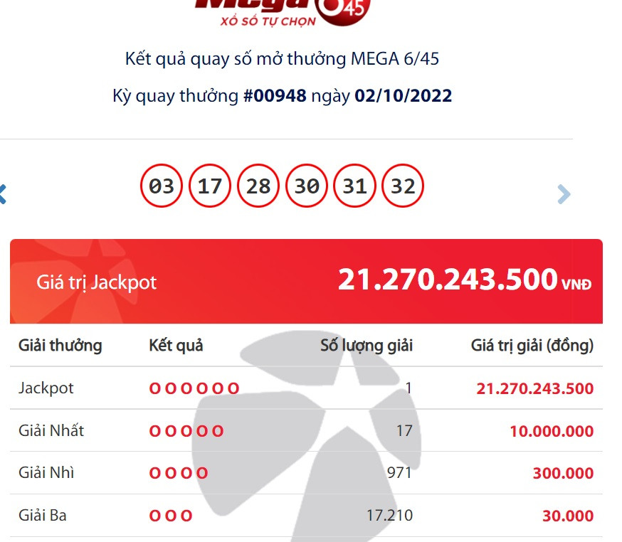 Kết quả xổ số Vietlott tối 2/10 cho thấy, tại kỳ quay số mở thưởng thứ 948 loại hình xổ số Mega 6/45, Công ty Xổ số điện toán Việt Nam (Vietlott) đã tìm được duy nhất một chiếc vé trúng Jackpot trị giá 21.270.243.500 đồng.