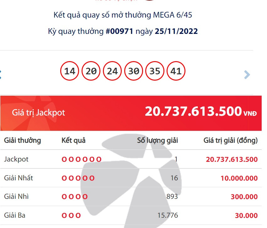 Kết quả xổ số Vietlott tối 25/11 cho thấy, tại kỳ quay số mở thưởng thứ 971 loại hình xổ số Mega 6/45, Công ty Xổ số điện toán Việt Nam (Vietlott) đã tìm được duy nhất một chiếc vé trúng Jackpot trị giá 20.737.613.500 đồng.