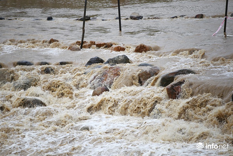 Lũ dữ từ thượng nguồn đã "ăn sâu" vào 2 bên bờ, nhiều đoạn nguy hiểm được rào chắn cảnh báo. |